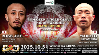そして2本目のBOM OFGタイトル戦が決定し、ミドル級(-72.57kg)王座を懸けてMIKE JOE(BATTLE FIELD/TEAM J.S.A)と喜多村誠(REACTGYM湘南)が対戦する。両者は2度BOMのリングで対戦しており、初対決となった22年7月のWPMFインターナショナル・ミドル級王者決定戦ではドロー。