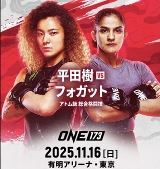 平田は、大胆な発言とアグレッシブなファイトスタイルでファンを魅了するONEの人気ファイター。ハム・ソヒ、三浦彩佳、ビクトリア・ソウザに3連敗を喫していたが、8月開催の大会で1年2か月ぶり復帰し、アーティ・カトリにパウンド連打で逆転勝利。復活をアピールすると、11月16日に東京・有明アリーナで開催されるONE日本大会『ONE 173』への参戦が決定した。