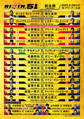 メインイベント(第14試合)では、RIZINライト級(71.0kg)王者ホベルト・サトシ・ソウザ(ブラジル/ボンサイ柔術)が5度目の防衛戦で、堀江圭功(ALLIANCE)と対決する。
