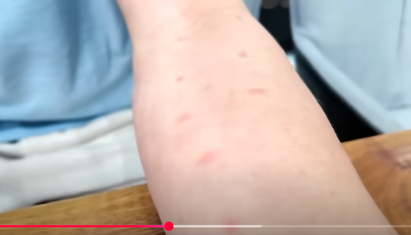 左腕は冷凍のアニサキス症を検査して反応が出た跡(『ほのぼのかいちゃんねる』)