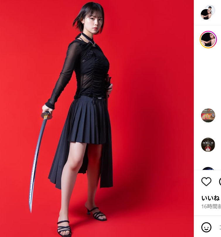 スカートに太ももを見せて刀を握りポーズを決める長野(@juria_210)