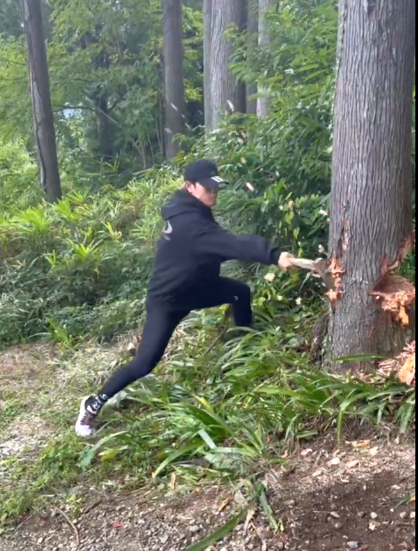 斧で木を伐採する特訓に取り組む佐々木(@JinSasaki0728)