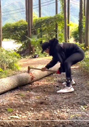 斧で木を伐採する特訓に取り組む佐々木(@JinSasaki0728)
