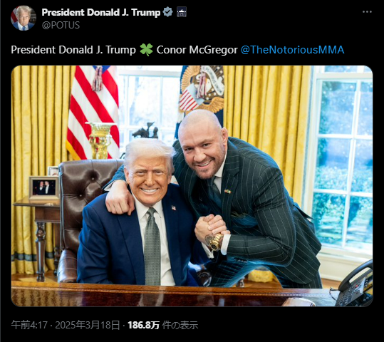 トランプ大統領(左)と固い握手を交わすマクレガー(@POTUSより)