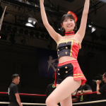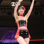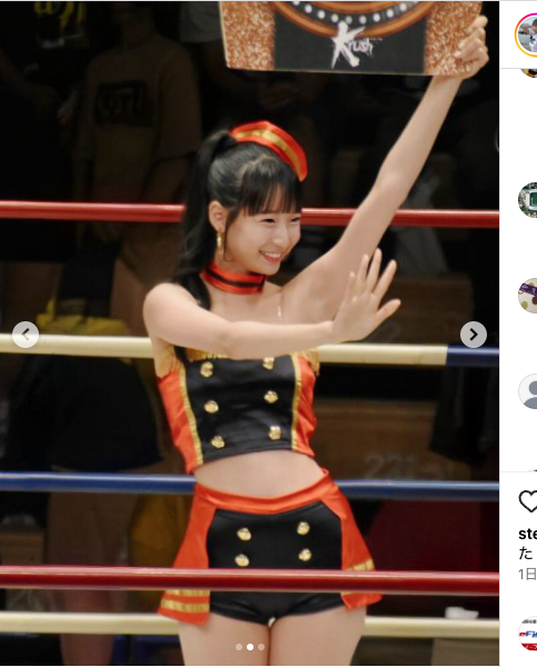 ラウンドガール姿で手を振るしおりん(@shiori819)