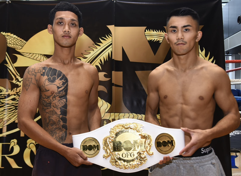 BOM OFGフェザー級王座決定戦で対戦する朝陽・エイワスポーツジム(右)とサイペット・ソーウィサヌポン(左)