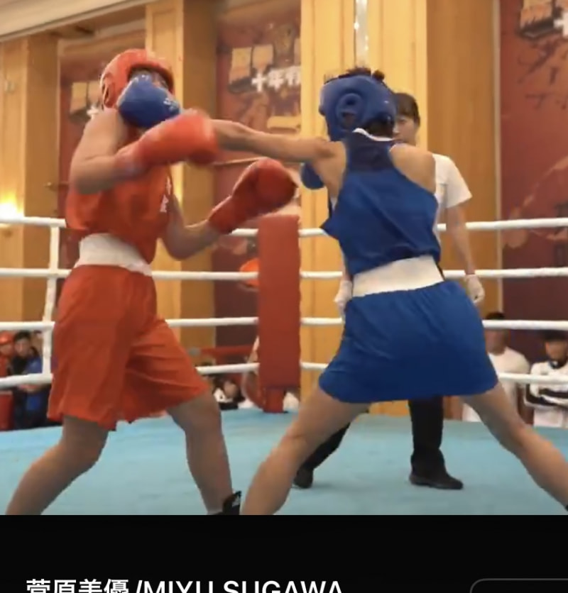 菅原(右)がボクシングデビュー戦で相手の顎を上げる(@miyuu11224028より)