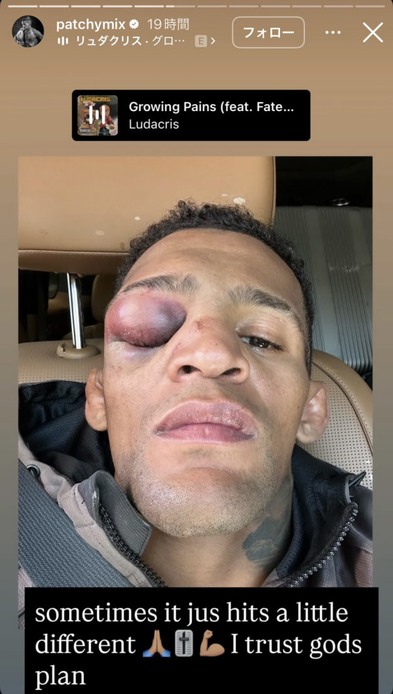 ミックスの赤黒くパンの案に腫れた右目(@patchymixより)