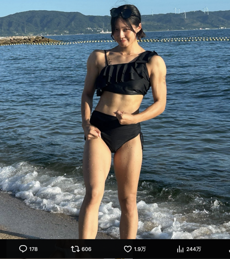 ビキニ姿でマッチョの榎本( 榎本樹羅 Xより)