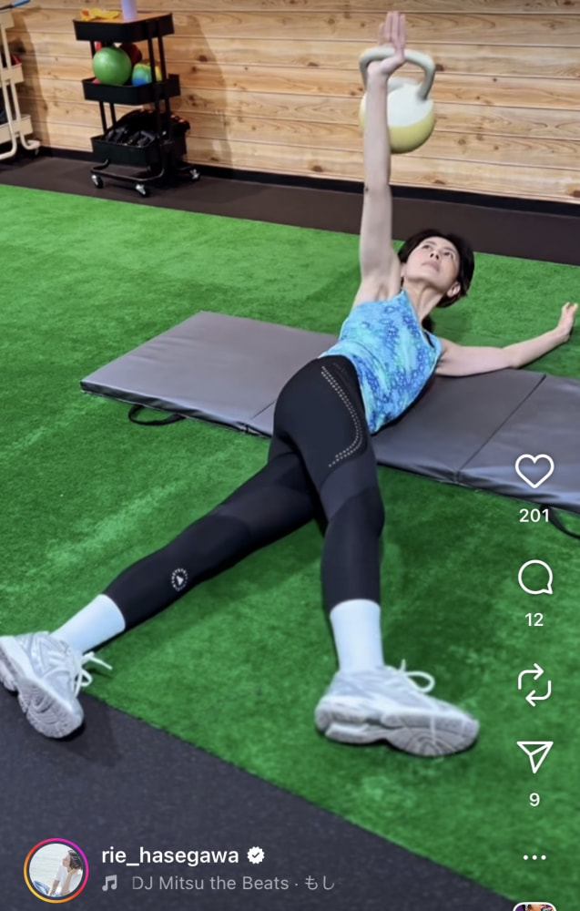 ケトルベルを使ったトレーニングを行う長谷川(@rie_hasegawaより)