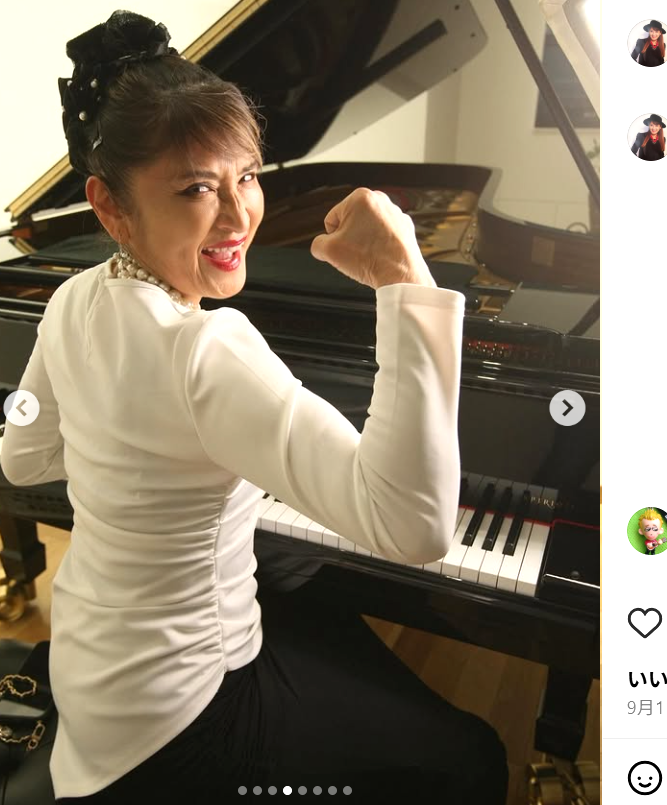 9月1日、ピアノを前にマッスルポーズの志穂美さん(※写真=保坂駱駝、@etsuko_shihomi