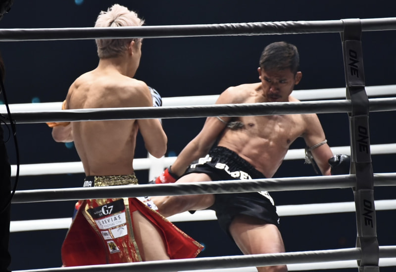武尊の足に強烈なローを蹴り込むスーパーレック
