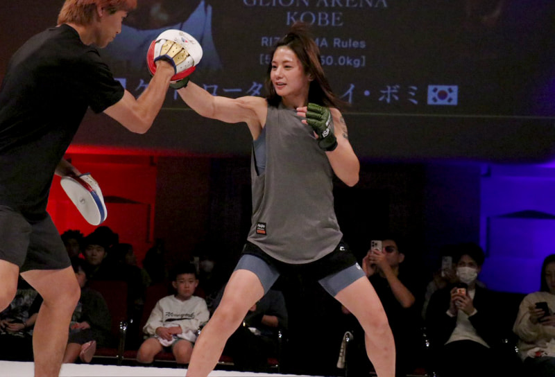 タンクトップに短パン姿でミット打ち