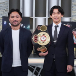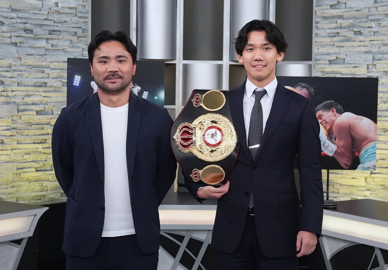 WBA世界Lフライ級王者の高見亨介(右)と、元WBC世界フライ級王者の比嘉大吾(左)が『エキサイトマッチSP』でゲスト解説(WOWOW)