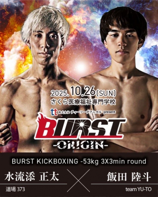 対する飯田もBURST初参戦で、昨年8月のNEXUSで1R46秒の衝撃KOでプロデビュー。10月の彪羽戦、今年3月のARUTO戦でいずれも判定負けで二連敗だったが、6月に聖希に勝利し再起を飾った。前戦となった9月には、半年前に敗れているARUTOとの接戦を制してリベンジ成功を収めた。激闘必至の一戦で勝利するのはどちらか。
