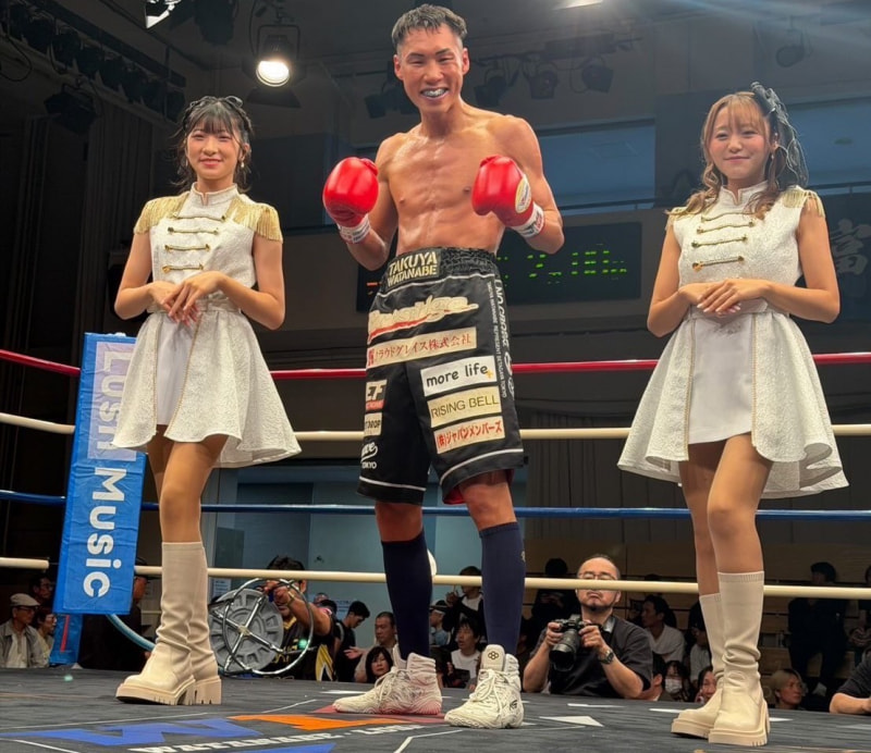 Sフェザー級8回戦で勝利した渡邉卓也と、ラウンドガールMIU(左)、ゆちゅか(右)