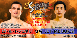 セミファイナルではS-BATTLE KICKミドル級王者ヴィトー・トファネリ(ブラジル/ブラジリアンタイ)が元MAX MUAYTHAIミドル級王者JET・MEIBUKAI(タイ/MEIBUKAI)を挑戦者に迎えて初防衛戦を行う。