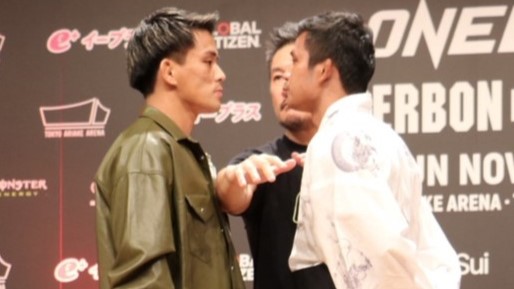 記者会見では、与座(左)とスーパーレック(右)が睨み合い!