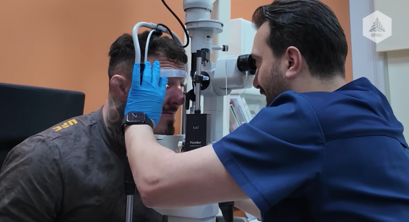 目のチェックを受けるアスピナル@Tom Aspinall Official