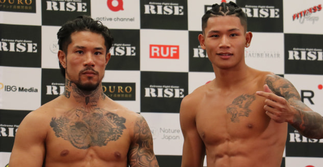 中村寛(左)、彫刻のようなバキバキ腹筋で計量パス!ペンジェー(右)と対戦