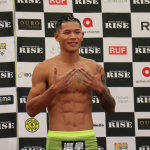 中村寛(左)、彫刻のようなバキバキ腹筋で計量パス!ペンジェー(右)と対戦