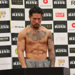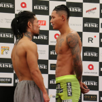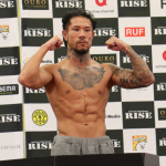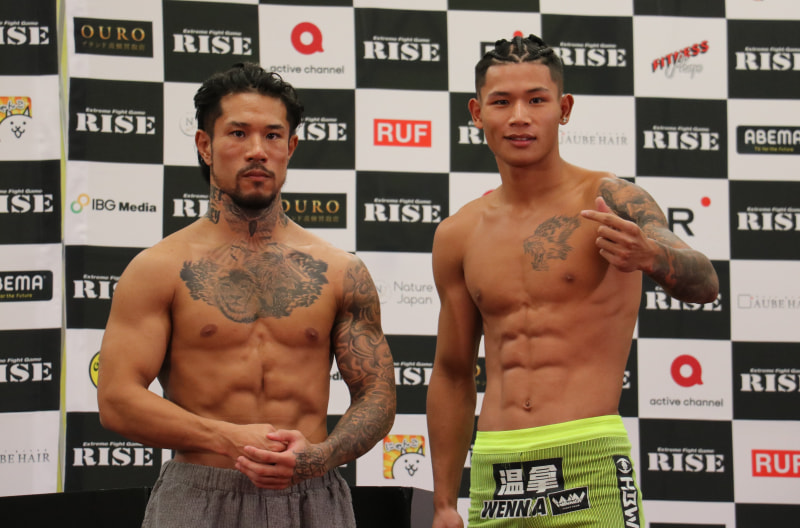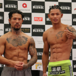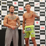 中村寛(左)、彫刻のようなバキバキ腹筋で計量パス!ペンジェー(右)と対戦