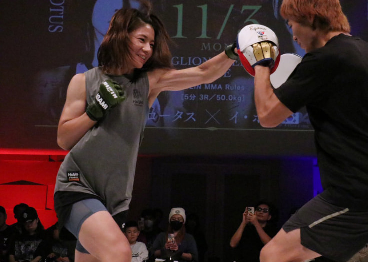 鍛えた腕を見せ、ミット打ちを披露したケイト(左)