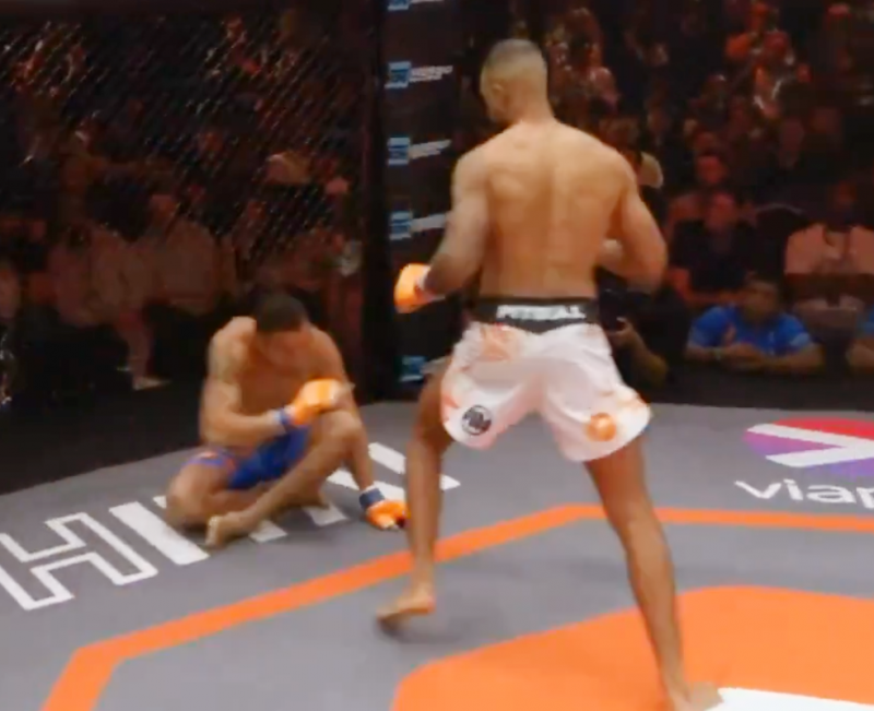 カーフキックが効いたフリオは崩れ落ちる(@CSTodayNews)