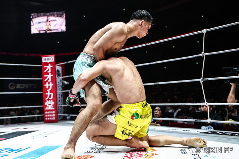 金原のタックルにYA-MANが右アッパーを合わせダウンを奪う。そのままパウンドに