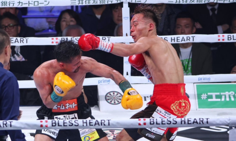 比嘉(左)が堤(右)に強烈な左を打ち込む!
