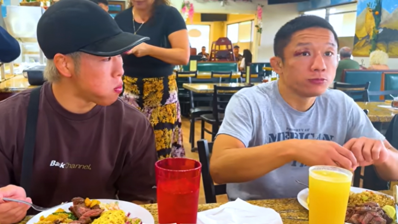 神龍と並んで食事をする堀口。右目上の傷口が見えた(『堀口恭司 Kyoji Horiguchi』YouTubeチャンネル)