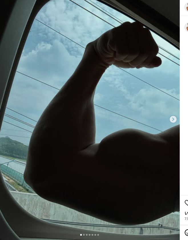 車窓をバックに力こぶ(@nakayama_kinnikun)
