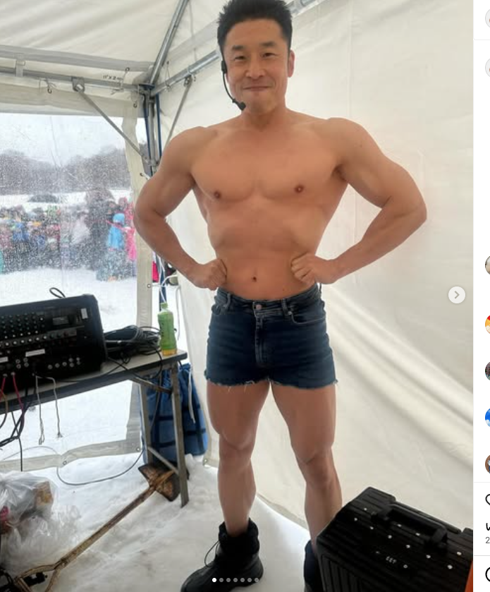 雪山での営業で裸のきんに君(@nakayama_kinnikun)