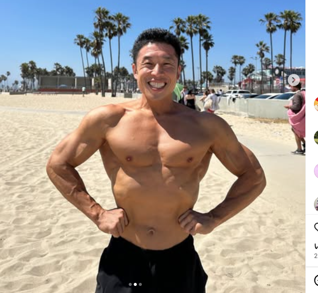 ビーチでポーズをとるきんに君(@nakayama_kinnikun)