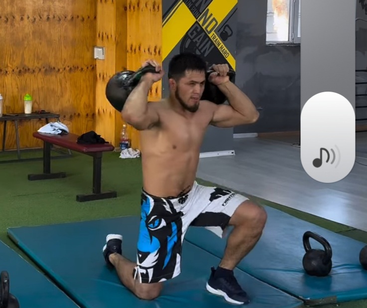 ケトルベルを両肩にかつぎ、フロントレンジを行うシェイドゥラエフ(@rajabali__shaidullaev)