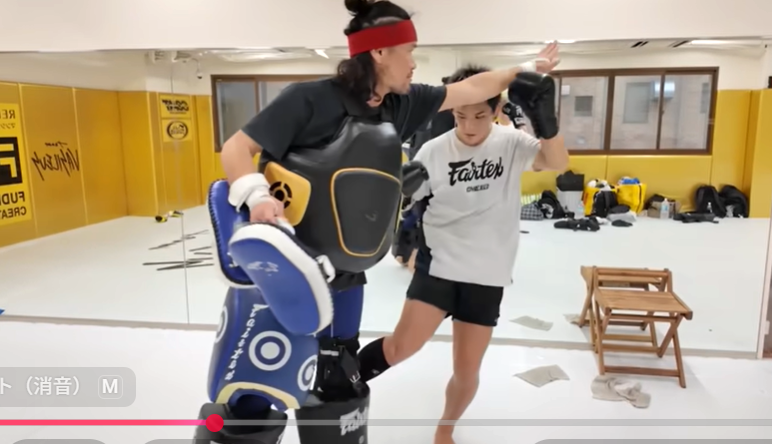 相手の前手のブロックを外して右に入ってのカーフキック(『与座優貴 Yoza Yuki / official』YouTubeチャンネル)