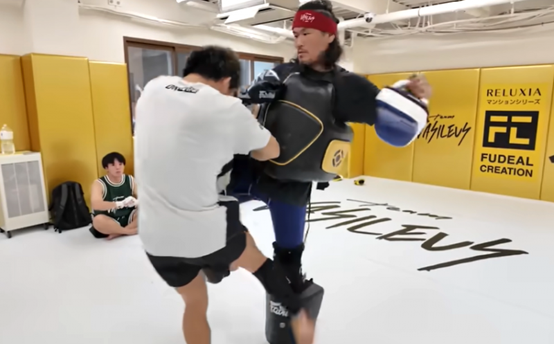 相手の左に入るとヒザ蹴りが飛んでくるがブロックしながらの右カーフキック(『与座優貴 Yoza Yuki / official』YouTubeチャンネル)