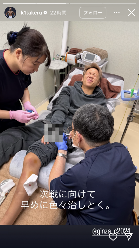 武尊は痛めた右手を治療し、激痛で顔を歪めた(武尊インスタグラムストーリーより)