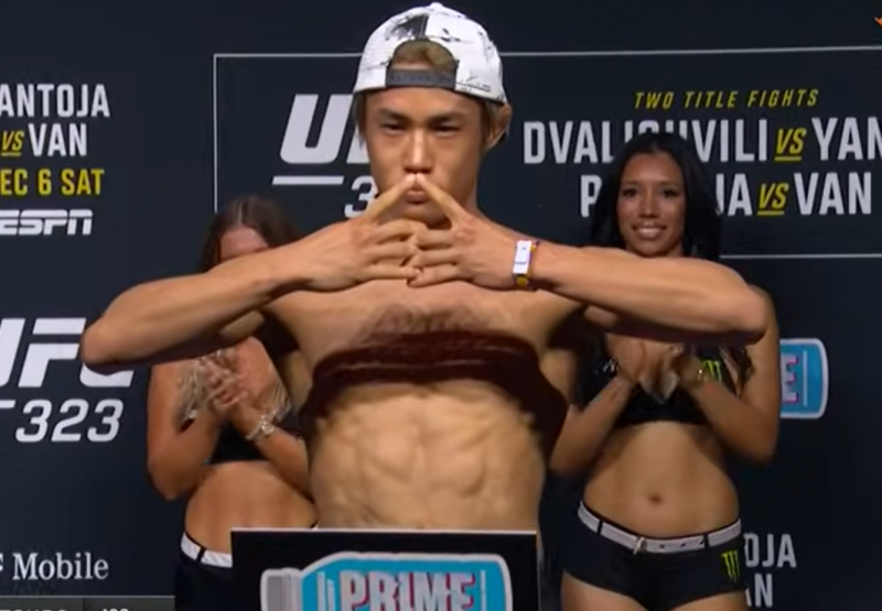 マンガ『NARUTO』に登場するポーズで計量パスを喜んだ平良(UFC公式YouTubeチャンネル)