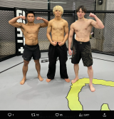 - 水野(中央)が試合前ラストスパーリングを終え、仲間とマッスルポーズ(@aratajo_jomma)