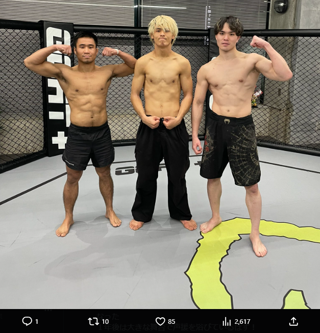 水野(中央)が試合前ラストスパーリングを終え、仲間とマッスルポーズ(@aratajo_jomma)