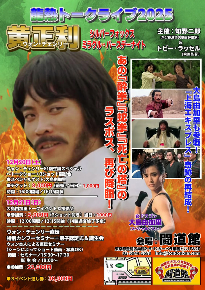 “酔拳ラスボス”ウォン・チェンリー来日!81歳生誕祭に大島由加里も集結、カンフー直伝セミナーも=12.20~21[2025/12/11]