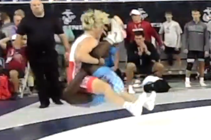 ジャンプしてヒップドロップを相手に落とす白人選手(@its_The_Dr)