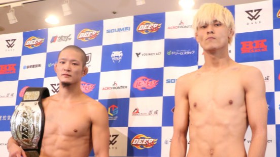 王者の青井(左)と挑戦者の水野(右)が計量パスした