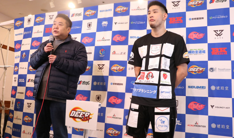 DEEPの佐伯代表が、雅が交通事故に遭ったことと試合が中止になったことを報告。右は対戦予定だった平松
