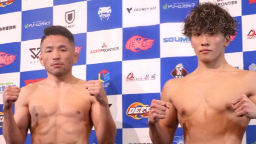 王者・越智(左)と挑戦者・杉山(右)が計量パス