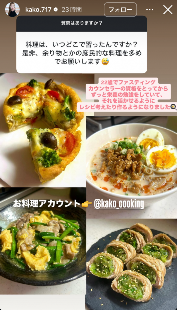 料理も得意な央川は、ファスティングカウンセラーの資格を持っている(@kako.717より)