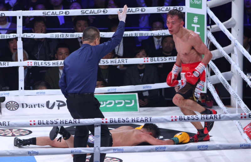 比嘉がバタリと倒れダウン