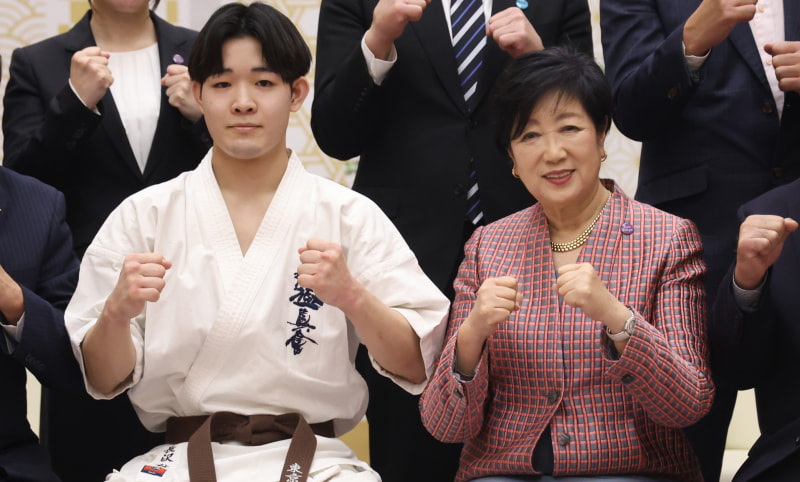 小池知事が難聴の新極真 都大会チャンピオンとファイティングポーズ