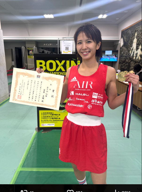 試合コスチュームで優勝を報告する菅原(@miyuu11224028)
